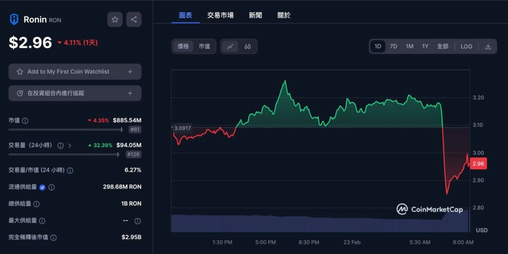 截稿前,Ronin 官方尚未出面证实以及说明是否确实遭骇,但是在稍早七点左右,RON 确实在短时间内重挫 10%,最低来到 2.85 美元。
