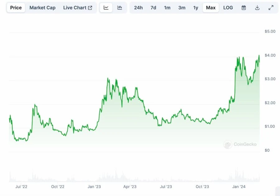 ARB 开盘价格在 1.5 美元左右,但因这种治理混乱、信任度和透明度不足、回应不及时、代币抛售引发的 FUD 情绪持续发酵,ARB 价格也在这之后的两周内一直在 1.2 美元浮动,随后配合大盘涨至 1.6 亿美元上方后,再次持续下跌,之后七、八个月一直在 1.3 到 0.75 美元之间震荡,然后从去年 12 月份开始稳步上涨,目前价格位于 1.8 美元左右。