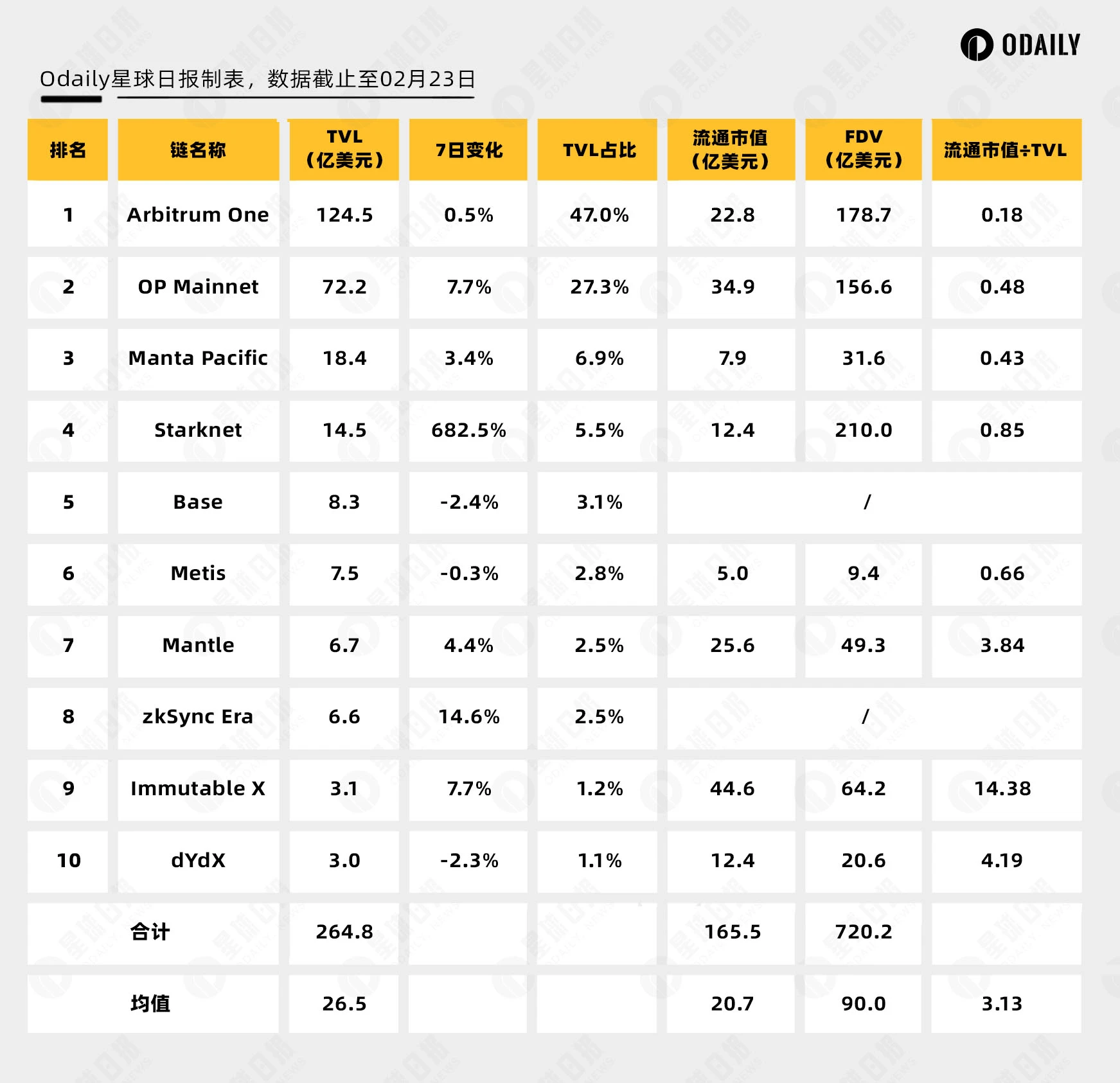 基于L2 Beat 的 TVL 数据和 CoinGecko 的市值数据,前十的L2数据如下。Starknet 在发币后 TVL 快速上升排名第四(因计入了 STRK 的市值),但流通市值同样高企。根据流通市值÷TVL 计算,位处估值偏高的范畴。但官方也随着代币空投开启了 Starknet DeFi Spring 进行交互激励,或有望通过各类活动和代币激励盘活生态。