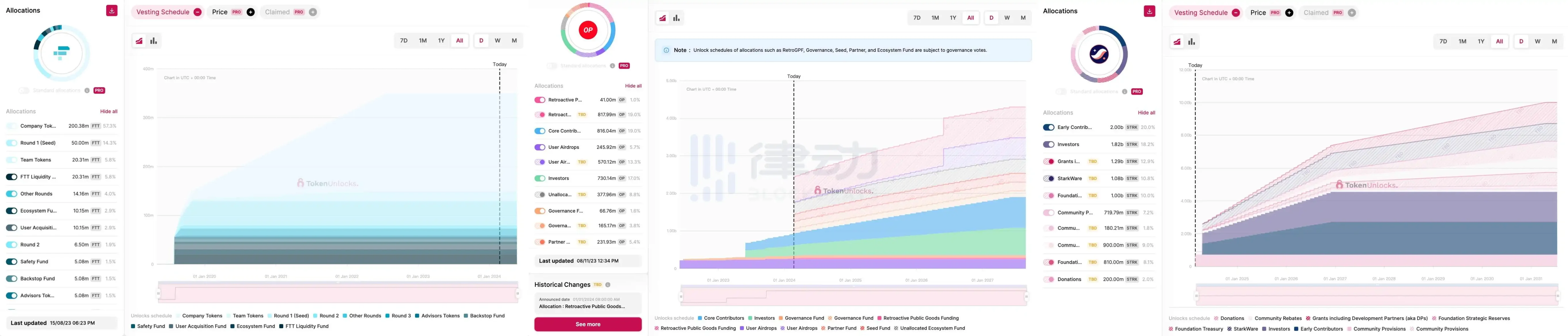 左:FTT 解锁时间线;中:OP 解锁时间线;右:STRK 解锁时间线(未更新最新版本)