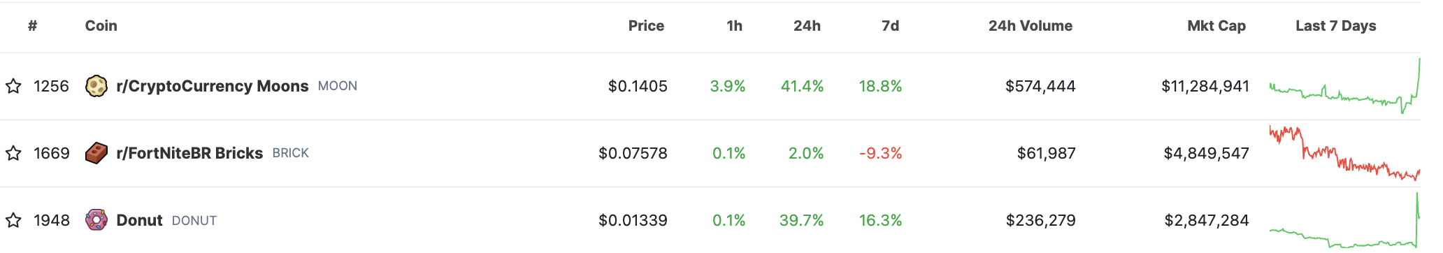 受此消息影响,与 Reddit 相关的代币皆迎来巨大涨幅,尤其是 $MOON 和 $DONUT ,在过去 24 小时内分别飙涨超过 41% 和 39%。