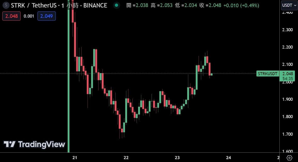 STRK 近 24 小时最高一度上扬超过 20%,达到 2.178 美元高点,至截稿前,报 2.048 美元,近 24 小时涨幅 8.5%。