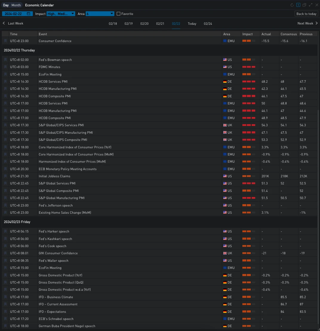 昨日(22 FEB)美国经济数据表现强劲,美联储官员也在持续为近期降息的预期泼冷水:当周初请失业金人数录得 20.1 万人,低于预期 21.8 万人,Markit 制造业 PMI 意外攀升至 51.5 ,高于预期的 50.5 ;费城联储主席哈克发出警告:最大的风险是过早降息,暂无降息的紧迫性;美联储杰斐逊同样表示了对过度宽松的政策可能导致通胀逆转或停滞的担忧,认为今年晚些时候降息可能是适当的。美债收益率因此逐步上行,两年期/十年期现分别报 4.739% /4.343% 。美国三大股指受英伟达超预期财报数据的提振上行,道指/标普/纳指分别收涨 1.18% /2.11% /2.96% 。