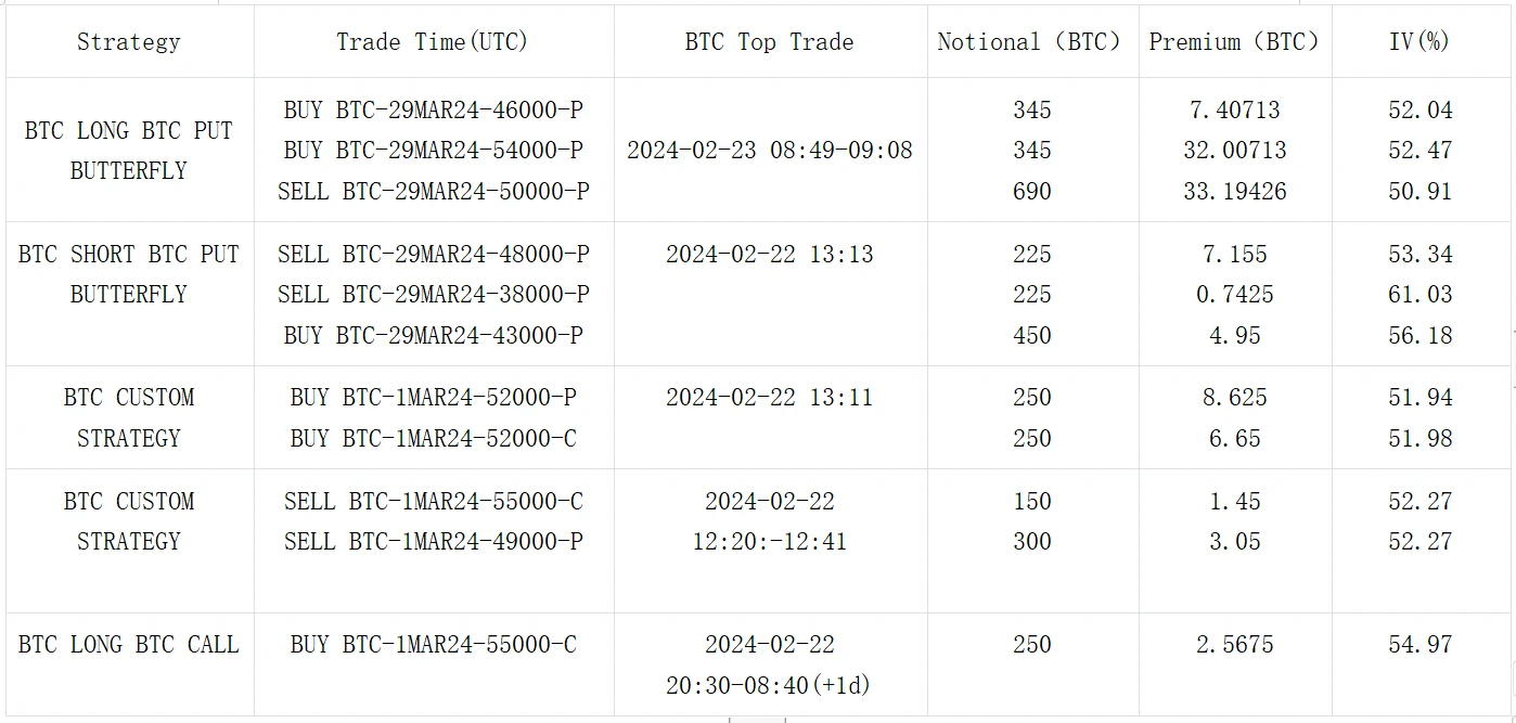 期权方面,隐含波动率曲线走陡下行,ETH 相对 BTC 的 Vol Premium 维持不变。从交易上看,BTC 成交集中在 1 MAR/29 MAR,其中看跌期权成交比例大幅上涨,主要由 1 MAR 50000/49000 Long Put Spread 和 29 MAR 的两组碟式看跌价差策略组成,文末附图展示了两组策略的损益变化。ETH 大多数成交也都集中在三月,净流入最为明显的是 3100/3200 买入看涨以及 3000 买入看跌。