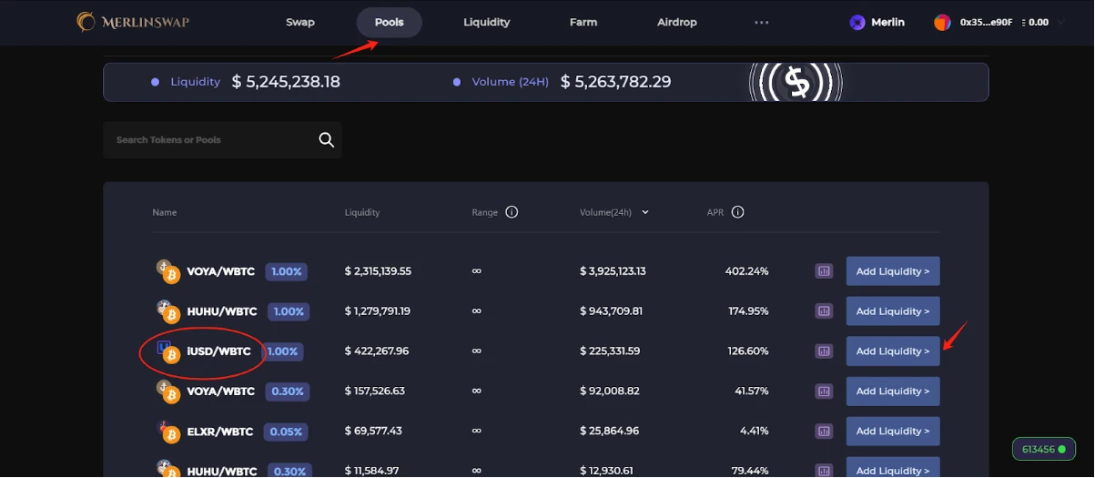 2. 选择一个交易对池子添加流动性,点击 Add Liquidity. 这里选择 IUSD/WBTC,因为刚刚用 BTC 兑换了 IUSD,钱包里正好有。