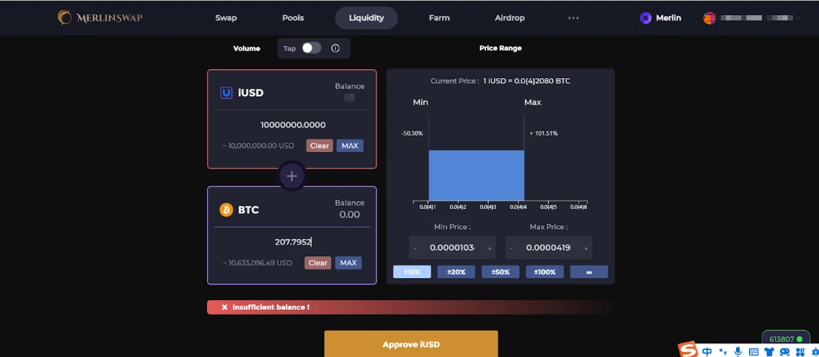 3. 输入 IUSD 的数量,点击 Approve. 拉起钱包签名。消耗 Merlin 链上的 BTC 做为 Gas,大约 0.7 USDT 左右。