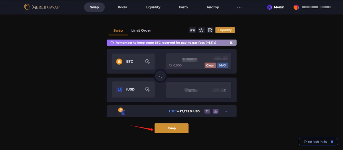 提供流动性: 为 Merlin Chain 的原生 Dex — Merlin Swap 提供流动性。