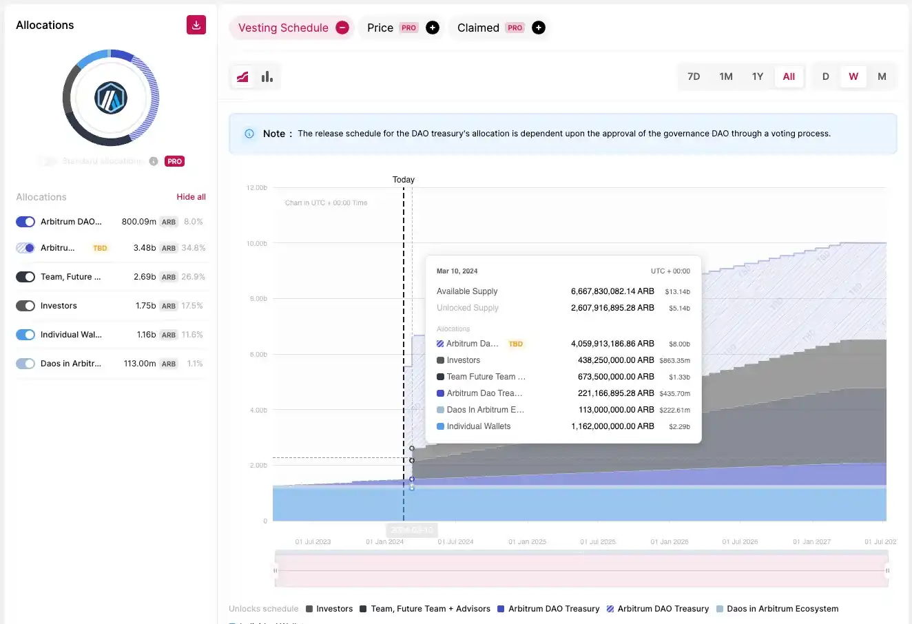 目前只有 12.75% 的 $ARB 代币在流通;超过 10 亿枚代币的大规模悬崖解锁将于 2024 年 3 月 15 日发生。随后,到 2027 年,每月将解锁超过 9000 万枚代币;