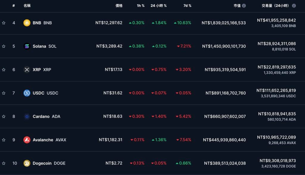 CoinMarkeCap 数据 显示 ,前十大币种近 24 小时则涨跌不一,BNB 和 AVAX 分别有 1.8%、1.3% 的涨幅;跌幅最大的则是 ADA,下挫 1.4%。
