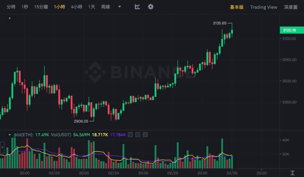 以 太坊(ETH)在刚结束的周末,从 2,900 美元持续震盪上涨,今(26)日清晨 08:30 左右,最高来到 3,150 美元,再度刷新 2022 年 4 月以来新高。