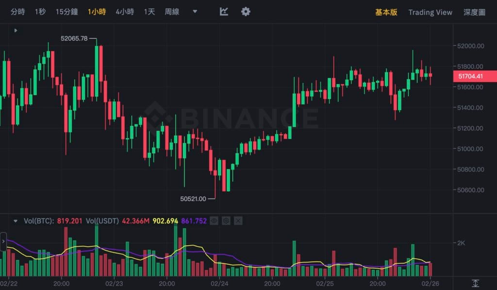 而在比特币(BTC)方面,BTC 周末多次跳𢧐突破 5.2 万美元未果,持续在 51,500 美元水平窄幅震盪。截稿前报 51,704 美元、近 24 小时上涨 0.39%,相较以太坊涨幅相对弱势。