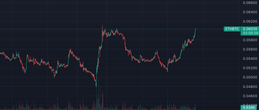 以太坊更强势的涨幅,使得 ETH/BTC 比率回升突破 0.06,现报 0.06035,近两周涨幅已超 18%、回到今年一月时的高点。