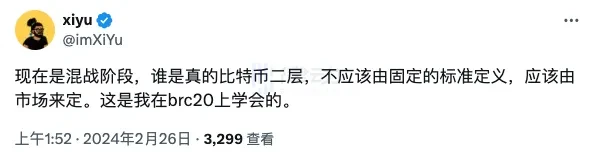 比特币生态早期 KOL xiyu 也表示:「现在是混战阶段,谁是真的比特币二层,不应该由固定的标准定义,应该由市场来定。这是我在 brc 20 上学会的。」