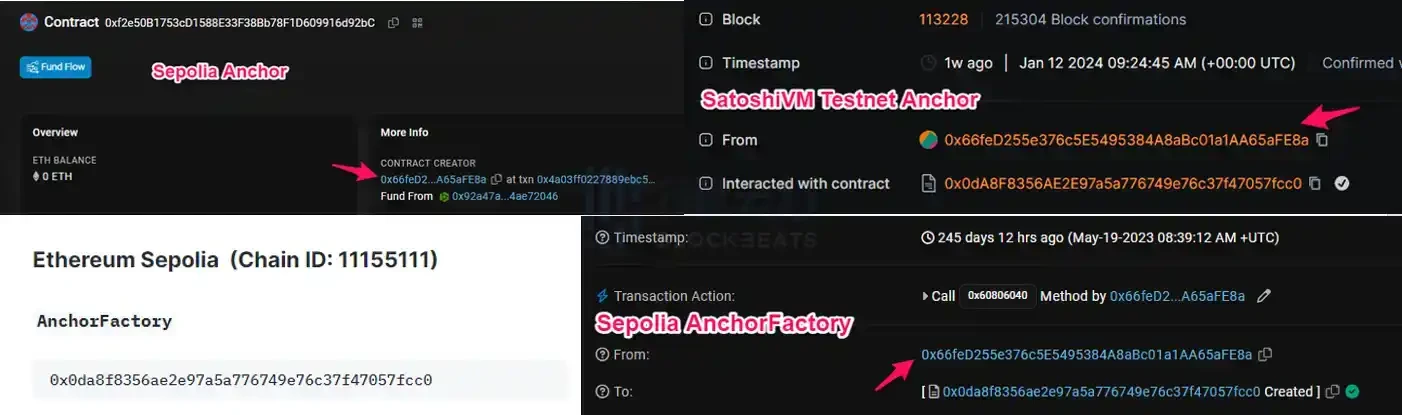 查看 Bool Network 文档,他们为我们提供了 Sepolia 上 AnchorFactory 合约的地址,显示该系统于 2023 年 5 月部署。而部署 AnchorFactory 的地址和和部署 SatoshiVM Anchor 的却是同一个地址: 0x66feD255e376c5E5495384A8aBc01a1AA65aFE8a。
