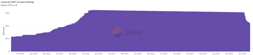 在美国 SEC 批准比特币 ETF 之前,灰度一直是比特币最大的持有者,并且由于 GBTC 的属性是一只无法赎回的信托基金形式,灰度的比特币持仓量一直以来处于只曾不减的状态。在比特币 ETF 通过后,这种状态被打破。由于 ETF 是具有赎回属性的基金,灰度的比特币持仓开始迅速减持。从 61.7 万个降至 44.5 万个。