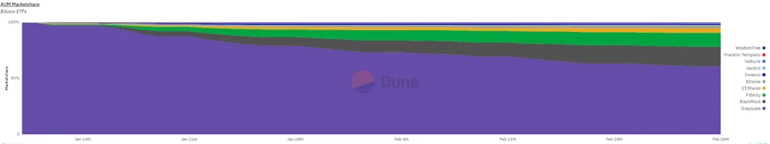除了灰度之外,贝莱德和富达投资则是目前的 ETF 发行商中最不可忽视的中流砥柱。贝莱德目前的 ETF 产品有 427 个,IBIT 产品的总资金管理(AUM)为 65 亿美元,在贝莱德 ETF 产品中排名在 82 名。随着市场趋于成熟,IBIT 在其中的排名仍有望继续上涨。而另一个资产管理巨头 Fidelity Investments(富达投资)也紧随其后,约为 46.5 亿。目前,灰度、贝莱德、富达投资的总资金管理规模合计占 ETF 的 90.6% 。