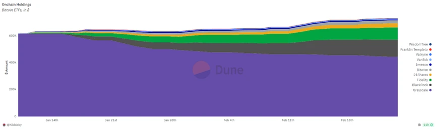 与之相对的是,贝莱德(BlackRock)推出的 IBIT 从 1 月 10 日的 228 个比特币增持到如今的 12.69 万个比特币。贝莱德是全球最大的资产管理公司,其在全球管理的资金规模约为 8.9 万亿美元。无论从客户资源还是品牌效果上,都是众多 ETF 产品中最具竞争力的一支。目前,贝莱德管理和富达投资的比特币 ETF 持仓量已超过 MicroStrategy 公司的 19 万个 。另一家 ETF 发行商 Fidelity 也将比特币的增持份额增加至 9.16 万个,这两家机构几乎将灰度减仓的比特币全部吃进。因此,从这个角度来看。比特币 ETF 的持仓增量还没有显现太大的效果,而是处于各个发行商之间互搏的阶段。