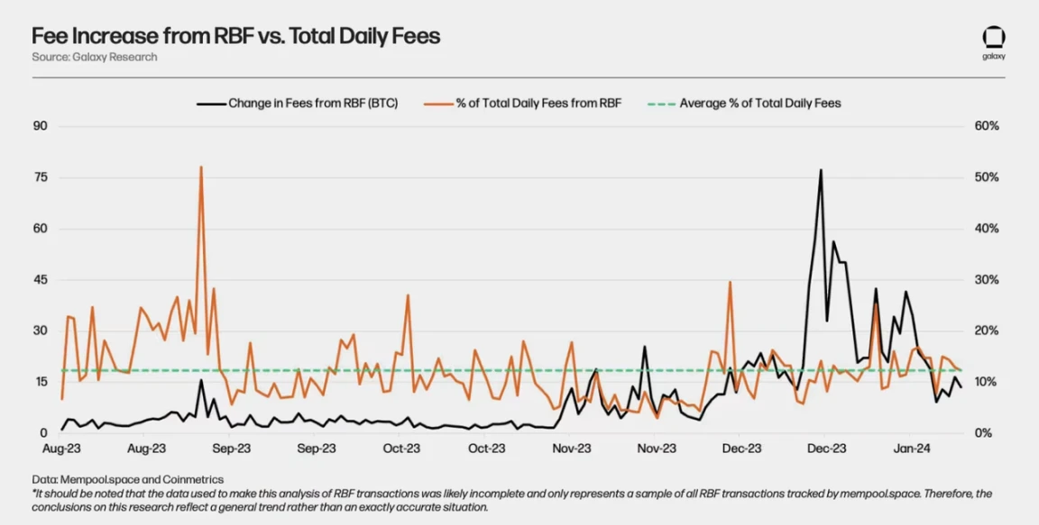 在正常内存池条件下,RBF 替代品产生的交易费用份额徘徊在 10% 到 20% 之间,在低费用期间飙升,在 2023 年 9 月达到 50% 的峰值。