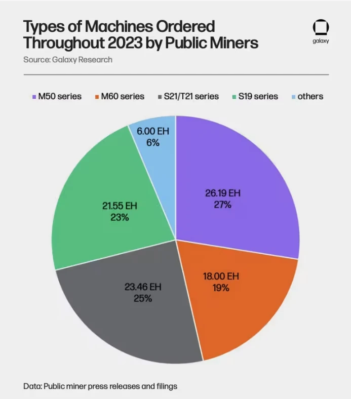 2023 年下半年,矿工采购订单增加了 59.3% ,从 39.4 EH 增加到 62.8 EH。矿工特别关注购买效率低于 20 J/TH 的新一代矿机,例如分别来自 Bitmain 和 MicroBT 的 S 21/T 21 和 M 66/M 56 。