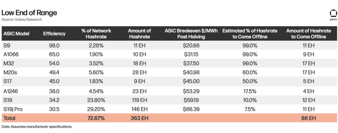 正如该分析所示,即使矿工的电力成本相对较高,最新一代的矿机(例如 S 21、T 21 或 M 60 S 系列)也能够以非常低的哈希价格获得盈利。这表明即使比特币价格没有实质性改善,减半后算力仍有很大的上升空间。此外,如果矿工能够获得廉价电力或者对矿机进行降频,他们仍然能够通过操作 S 19 j Pro 来盈利。由于 S 19 j Pro 目前占据了网络的绝大多数,我们可能不会观察到这些矿机中有很大一部分在减半后离线。