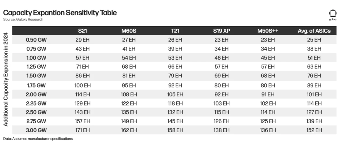 接下来,我们为 2024 年可能启用的额外基础设施容量创建敏感度表,假设这些新容量将通过各种新一代 ASIC 模型来启用。如果我们假设 2023 年通电的矿机的平均效率为 30 J/TH,那么这意味着当年新增产能为 8 GW。然而, 2023 年交付的增长和扩张能力很大程度上归因于 2021 年的投资周期。