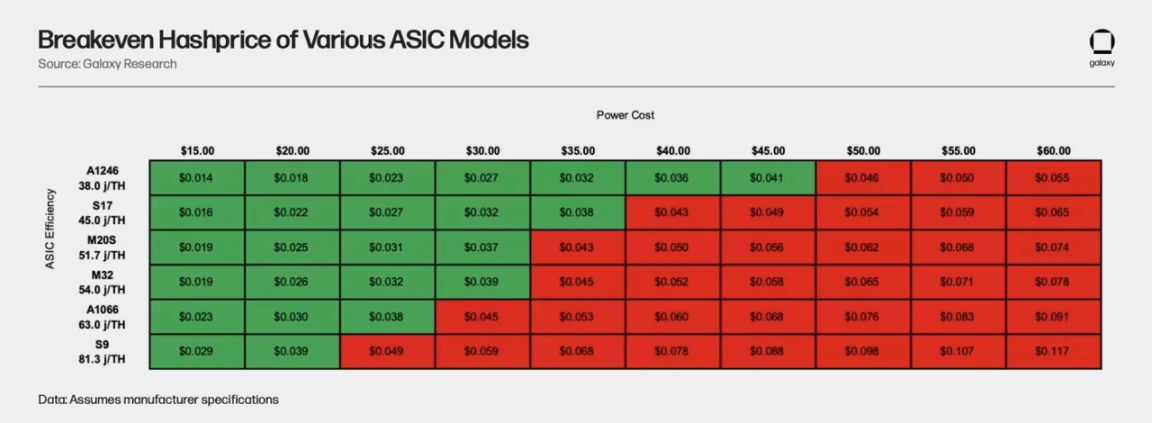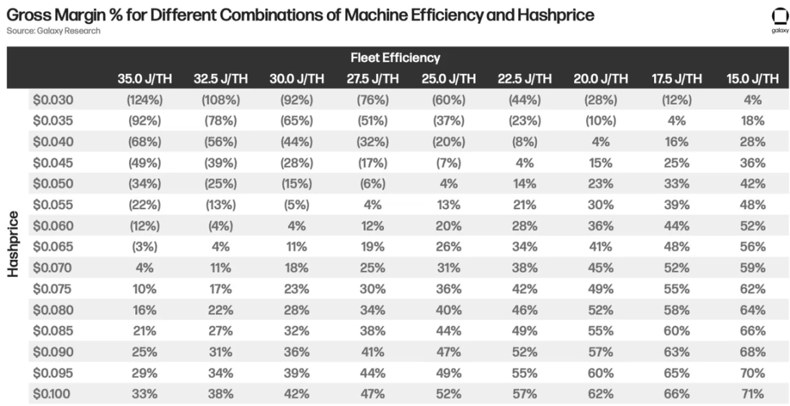 上表显示,在哈希价格为 0.07 美元时,效率为 35 J/TH 的机群产生的毛利率仅为 4% ,而效率为 17.5 J/TH 的机群仍保持强劲的 52% 。