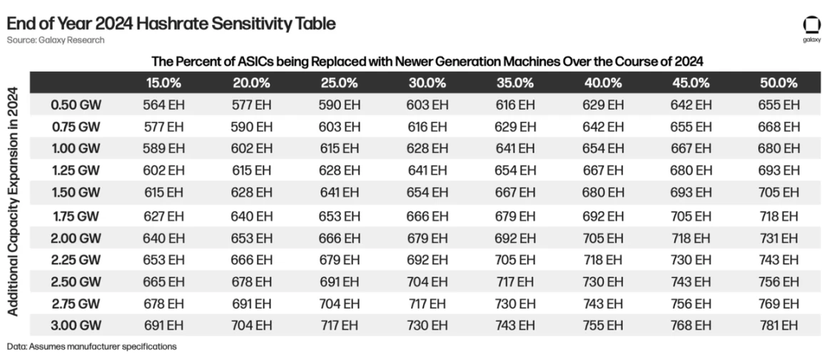 由于公共矿商关于基础设施扩张和 ASIC 购买的公告,我们认为 2024 年将新增 2 – 3 GW 基础设施容量,并且 2024 年 25 – 35% 的现有 ASIC 将被新的 ASIC 取代,这是合理的。根据我们的分析,估计 2024 年年底算力范围可能为 675 EH 至 725 EH,这相当于当年网络算力增长 35 - 45% 。