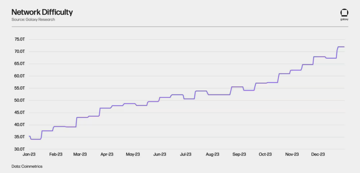 经历动荡的 2022 年之后,在比特币价格上涨、交易费用飙升和能源价格下降的推动下,矿商在 2023 年获得急需的喘息机会。算力的迅速上升抵消了其中一些变化, 2023 年算力增长 104% 。