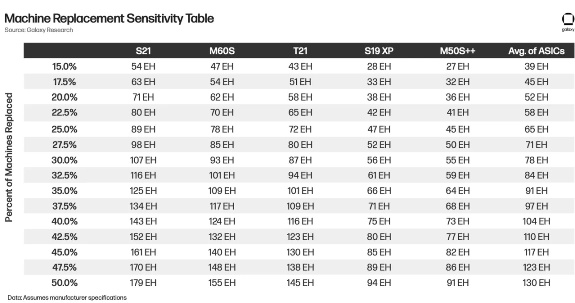 例如,该表表明,如果我们假设 25% 的矿机被 M 60 S 矿机替换,则网络哈希率将净增加 78 EH。