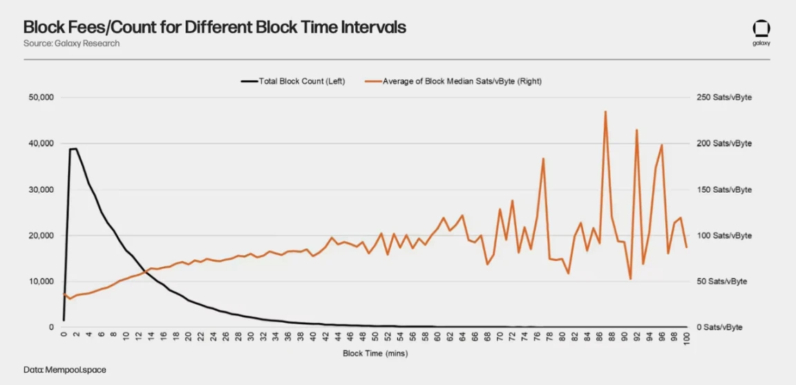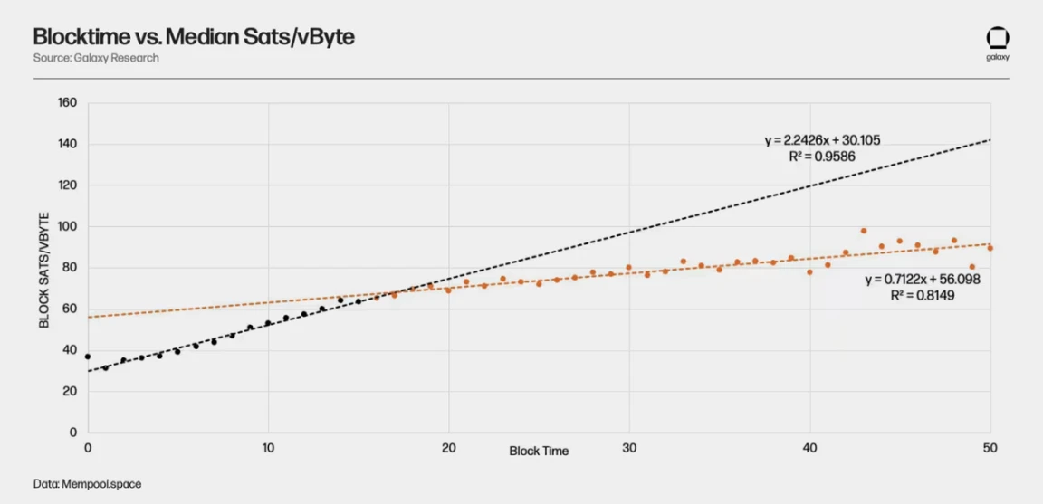 历史数据显示出块时间和费率之间存在密切关系。考虑到无利可图的矿工有可能在减半和区块时间增加期间下线,在下面的分析中,我们量化了增加区块时间可能对加剧费用压力产生的影响。