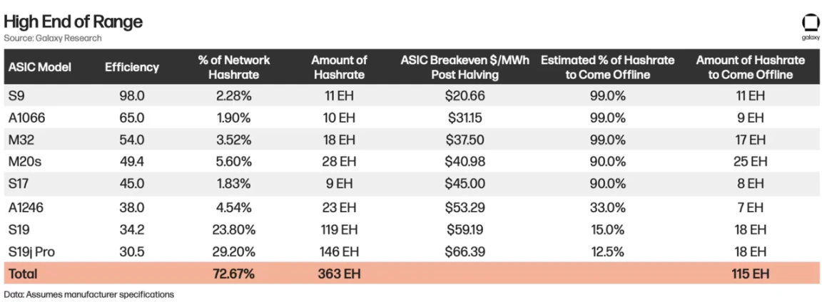 考虑到各种 ASIC 模型的盈亏平衡对比特币价格和交易费用占奖励的百分比有多敏感,我们估计来自下面介绍的 ASIC 模型的网络算力的 15 - 20% 可能会离线,这意味着 86 - 115 之间。