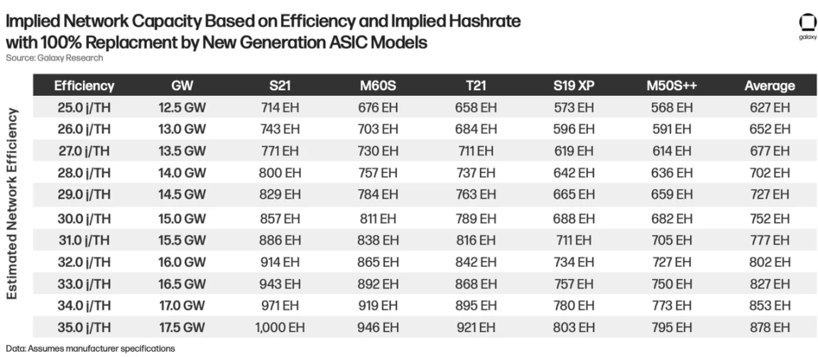 如果我们假设现有的平均网络效率为 30 J/TH,相当于 15 GW 的电力容量,如果假设网络中的每个现有 ASIC 都替换为分析中提出的 ASIC 模型分布均匀。 30 J/TH 是一个合理的基准假设,因为它相当于 S 19 j Pro 的矿机效率。