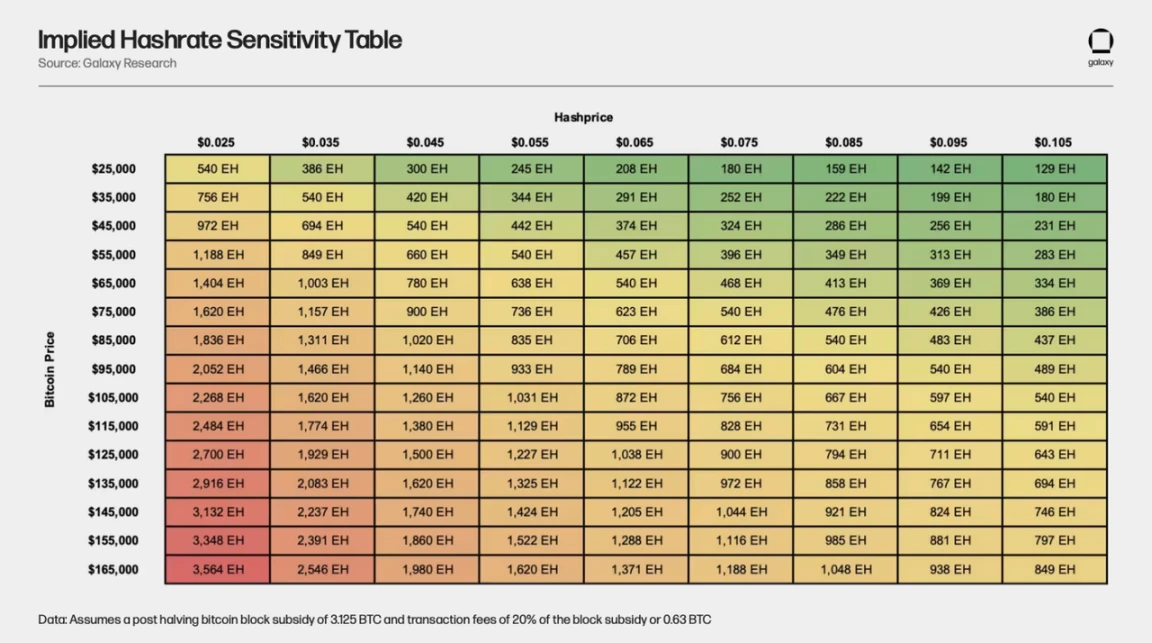 我们初步分析中,在假设交易费用为区块奖励的 20% 的情况下,考虑到不同的比特币价格水平和减半后隐含的哈希价格的不同水平,网络可以承受多少算力。