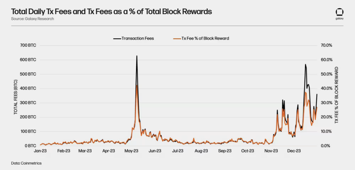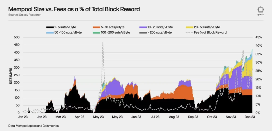 这项新活动的直接后果是交易费用波动性增加和内存池拥塞时期,这表明区块链上只需要很少的活动就能将比特币矿工的费用推至可持续水平(足以覆盖不断减少的比特币发行量) 。交易费用占整体区块奖励的百分比是通常用于比较不同时间的费用水平的指标。 2023 年,该网络经历了交易费用的绝对增长,并且奖励经常飙升至 25% 以上,这相当于减半后矿工收入的一半左右。