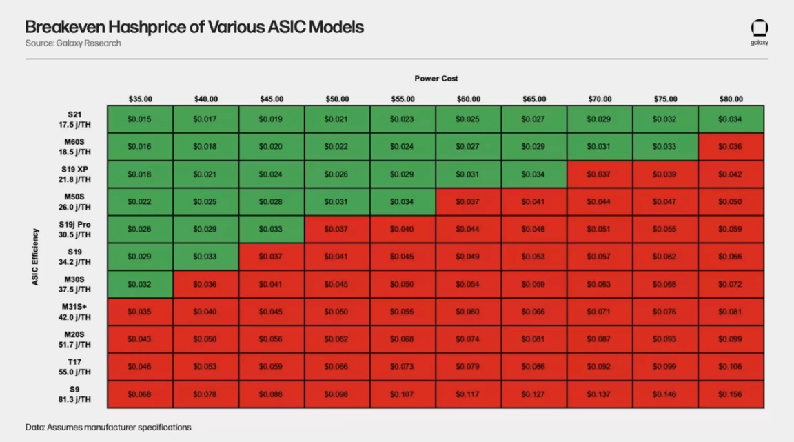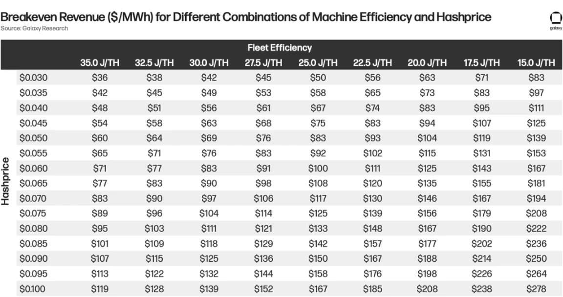 下表显示了在不同的队列效率和哈希价格组合下产生的每兆瓦时的盈亏平衡收入(以美元为单位)。电力成本高于这个盈亏平衡阈值将导致 ASIC 无法盈利。在撰写本文时,哈希价格为 0.082 美元(BTC 价格为 4.3 万美元, 10% 费用, 520 EH),在其他条件相同的情况下,哈希价格在减半后将降至 0.045 美元。在这个哈希价格水平上,拥有 30 J/TH 机队效率的矿商需要能源价格低于 63 美元 /MWh 才能获得正的毛利润。