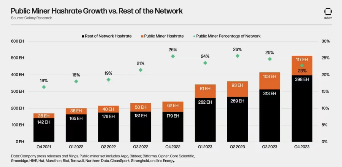 2022 年加密市场的崩溃,加上利率上升,使得上市比特币矿商筹集新股本或发行债务变得极其困难。因此,股票和债务资本市场在 2023 年上半年基本保持关闭,这使得上市矿商在 2023 年的大部分时间里难以优先考虑增长。其他地区的矿商也开始削减北美矿商的算力份额。 2023 年下半年,随着矿业经济好转,股权资本市场对矿业敞口的需求更大。北美矿商通过公开市场获得资本,使他们在矿业增长周期中相对于私人矿商和其他地区的矿商具有巨大的优势。