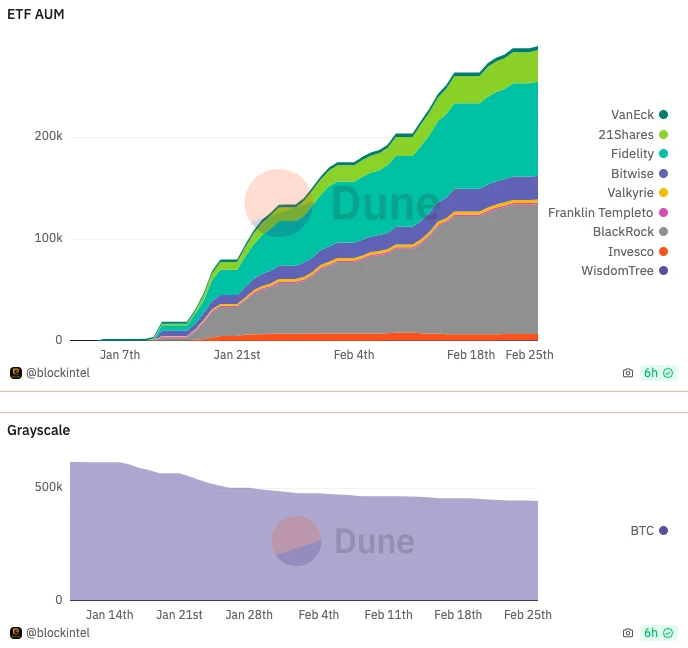 从各大交易所的储备状况来看,Binance 二月储备金证明显示,截止 2 月 1 日,Binance 用户 BTC 净余额为 594688 枚,平台 BTC 净余额为 609477 枚;OKX 第 16 期储备金证明则显示, 2 月 OKX 用户 BTC 净余额为 135969 枚,平台 BTC 余额为 140086 枚。 由此对比可知,刚刚获批一个月的 ETF 在 BTC 持仓方面已接近 Binance 加 OKX 等两大头部交易所的总和。