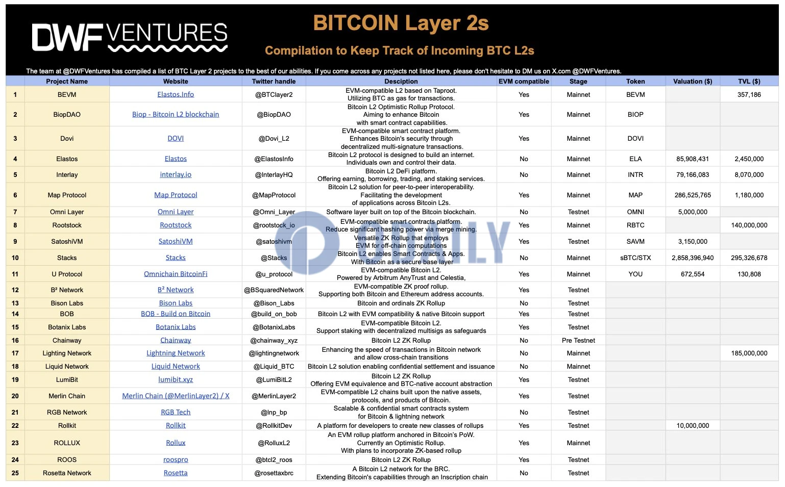 包括 Merlin Chain、BounceBit、B² Network 在内的比特币 Layer 2 网络或兼容网络已增长至 25 个(DWF Ventures 本月统计),其中部分项目已斩获不菲的融资,还有一部分项目则已累积了可观的 TVL 数额。