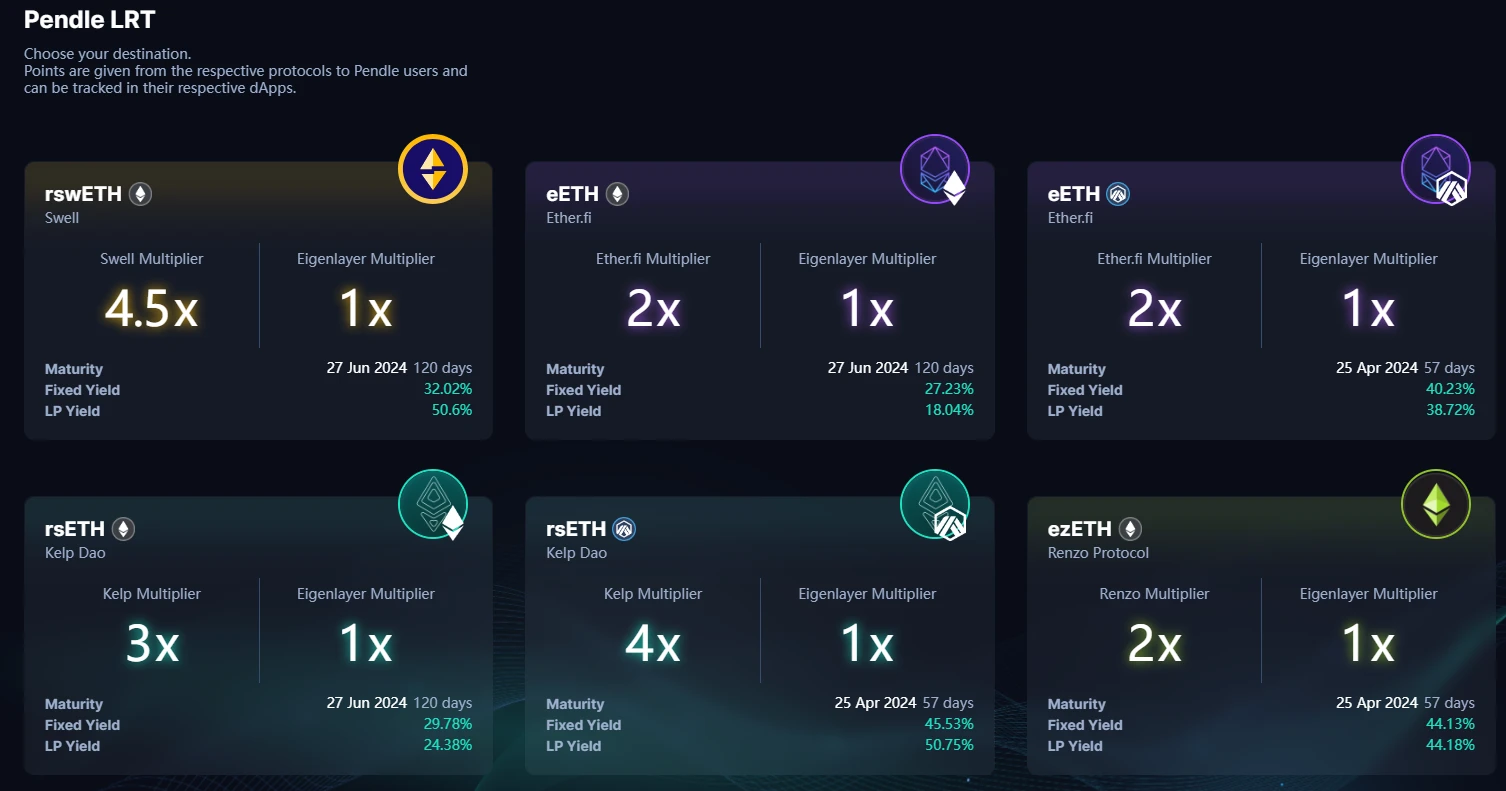 Pendle 为 LRT 推出了专有导航界面如下图所示,各协议的到期固定收益约在 30% ~ 40% 的区间内,到期日分别为 120 天和 57 天。值得注意的是,只持有 PT 意味只获得固定收益,放弃了积分和质押收益。