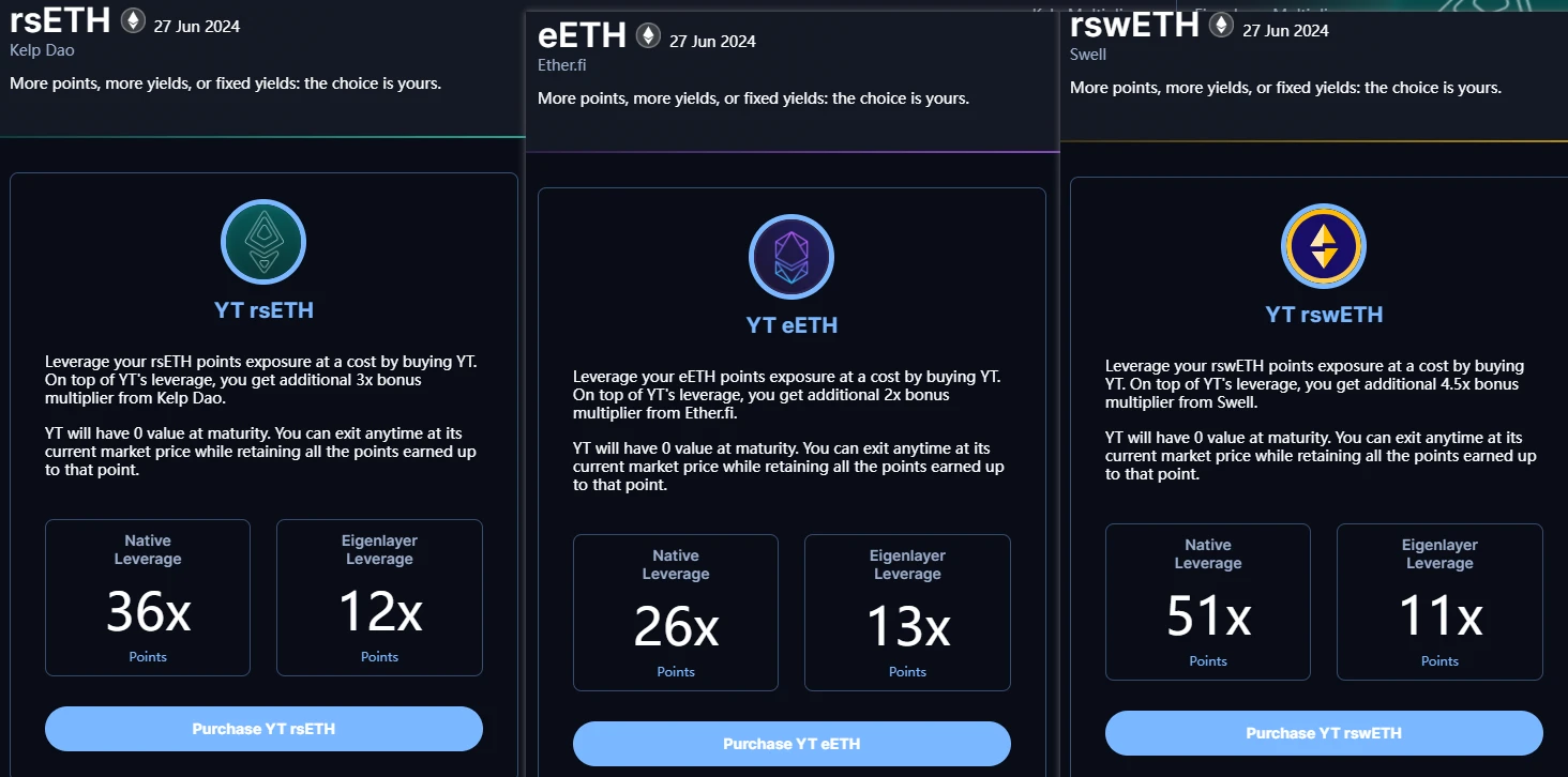 而购入 YT 则相当于使用了杠杆获取 EigenLayer 积分和项目积分,Odaily星球日报对部分 YT 产品截图如下,几个协议的 YT 相当于以十倍杠杆获取 EigenLayer 积分,并附有不同倍数的杠杆积分。