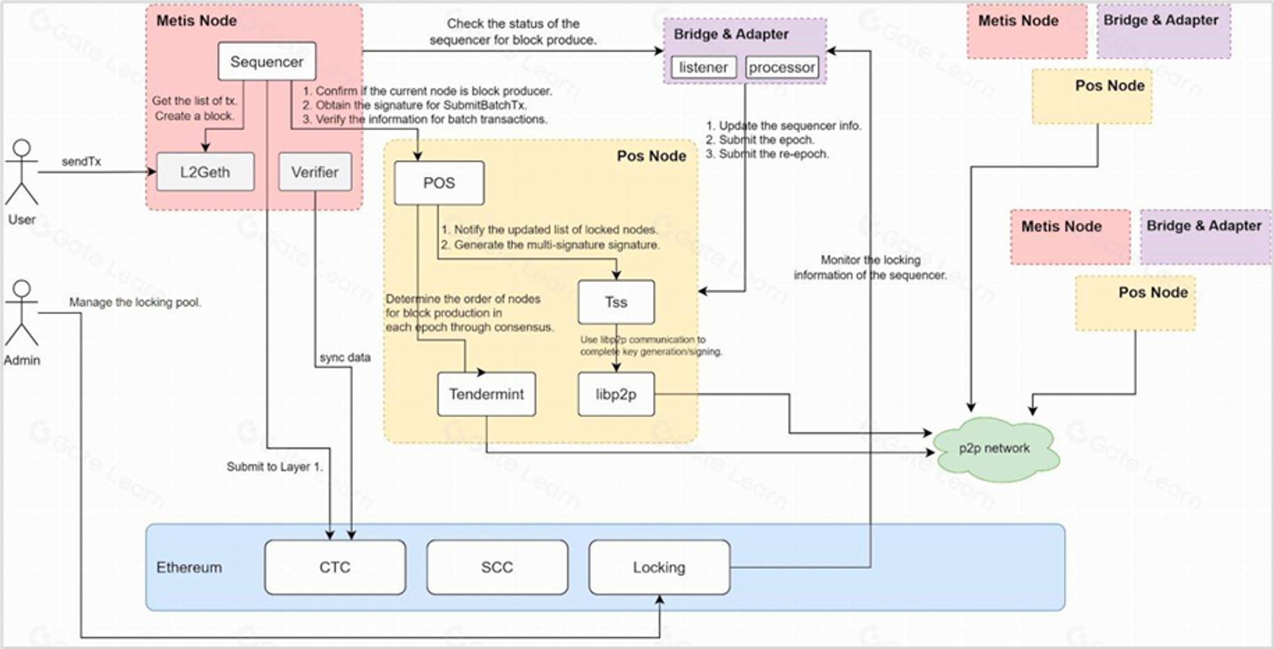 首先,Metis 的去中心化排序器网络中会有一个 Admin 的角色。Admin 的指责就是管理去中心化排序器系统,包括将符合要求的排序器节点添加至 Sequencer List 白名单,设置单个节点的质押上限、区块奖励的释放速度等等。