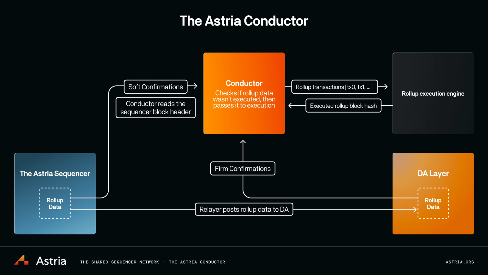 交易数据排序完成后,Astria 的 Conductor 会针对每个定序的区块,解析不同的 Rollup 所需要的数据,并对该批数据进行验证,包括验证区块是否已最终确认、提取的 Rollup 数据是否完整、正确、并被正确排序等等。验证完成后,Conductor 会将 Rollup 的定序数据转化为事务列表,传递给 Rollup 的执行引擎进行执行。
