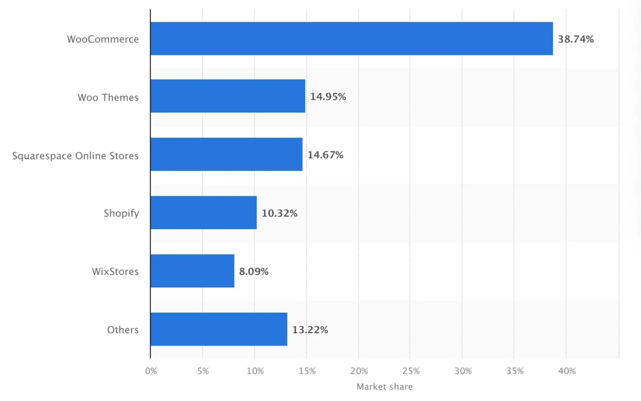 WooCommerce 在可定制电子商务平台中占据市场主导地位,拥有 39% 的市场份额(相比之下,Squarespace 为 15% ,Shopify 为 10% )
