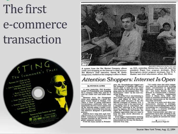 第一次电子商务交易发生在 1994 年。这是一张斯汀《十个召唤师故事》的 CD,它创造了历史,并登上了头条新闻。