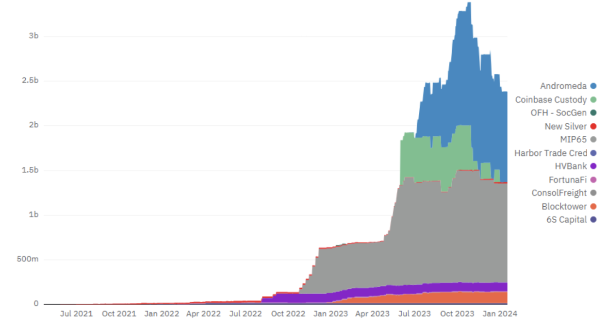 尽管有所下降,但 RWA 继续对 Maker 的稳定费做出重大贡献,约占 2023 年 12 月协议产生的所有稳定费的 48% 。这一贡献凸显了 RWA 在 Maker 生态系统中日益增长的重要性,以及继续依赖 RWA 作为 Maker 持续且极其强大的收入来源;
