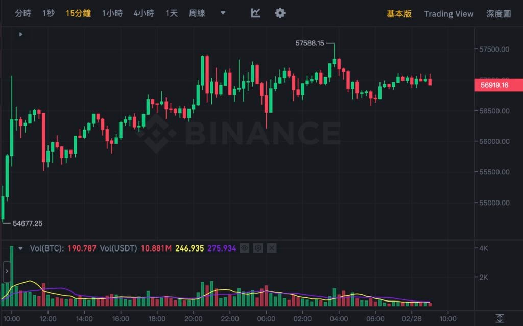 比 特币昨日拉涨 10% 以上突破 5.7 万美元,刷新今年新高。虽然一度卖压涌现又跌破 5.6 万,但很快又反弹上涨,今(28)日接近四点左右更触及 57,588 美元,相当强势。
