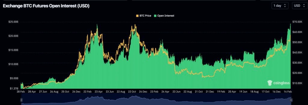 不过要注意的是,根据 CoinGlass 数据显示 ,当前交易所的比特币期货未平仓合约达到 244 亿美元的历史新高,超越上一次牛市结束(2021 年 11 月)时的最高水平。