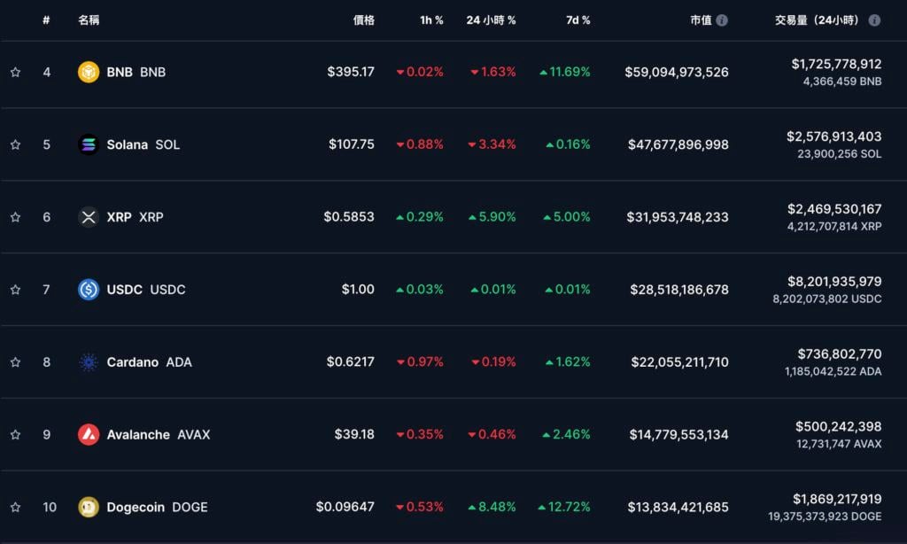 - BNB、SOL、ADA、AVAX 则分别有 0.2~3% 的跌幅。