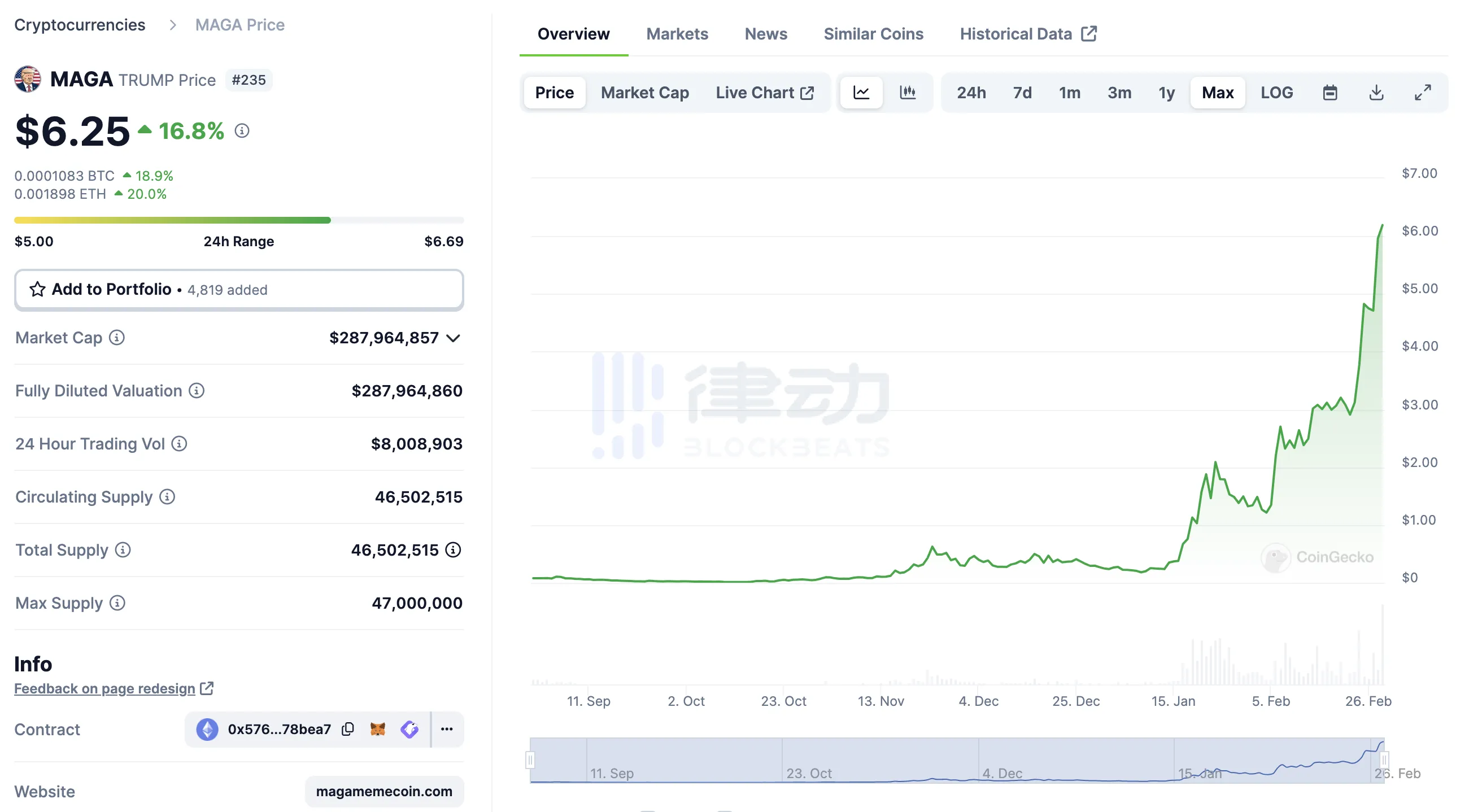 2 月 6 日,TRUMP 的价格为 2.2 美元,按照当前 6.25 美元的最新价格计算,当日建仓 TRUMP 目前已经获得 184% 的投资收益。