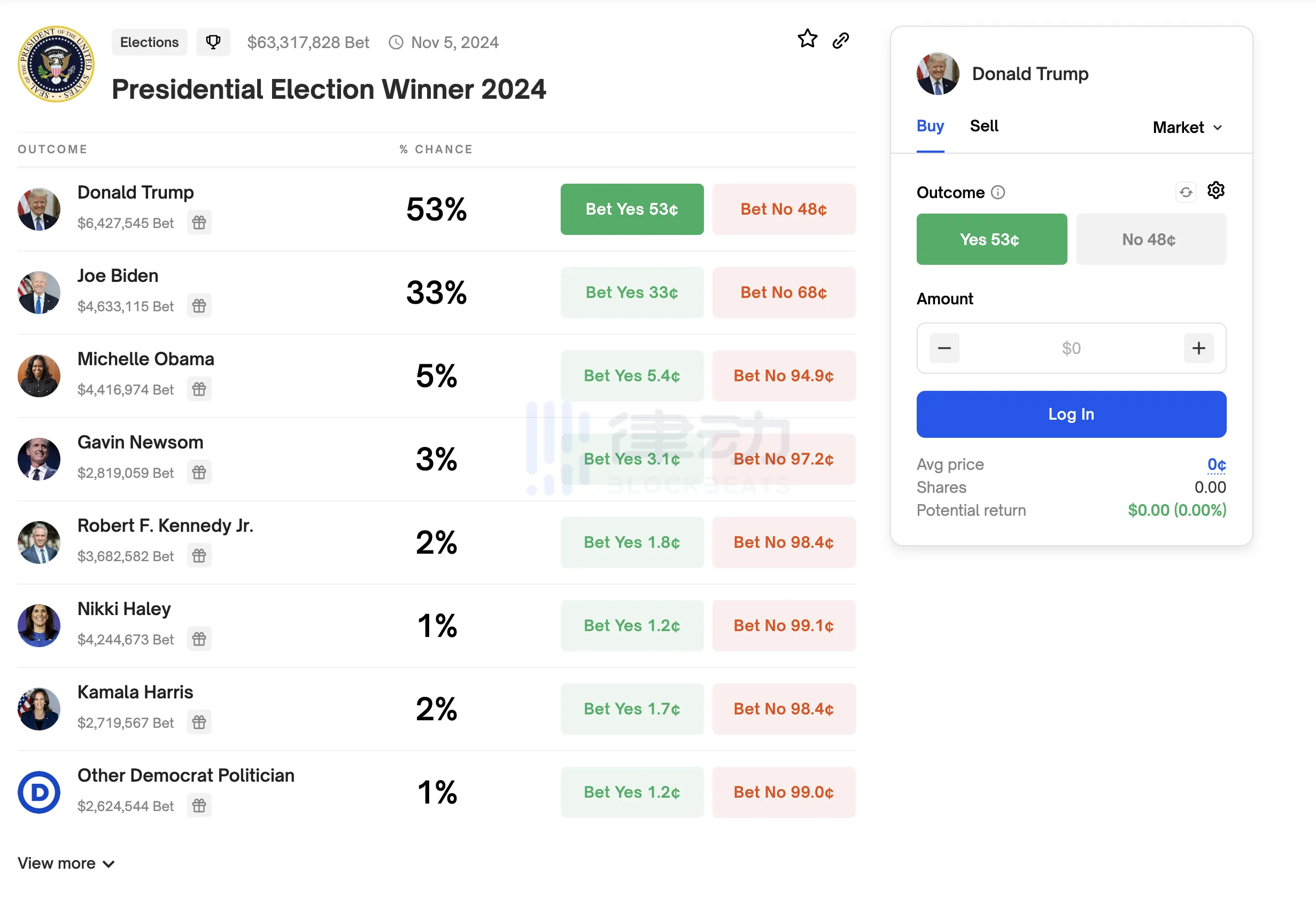 除了购买 meme 币和 NFT,参与 Polymarket 上的「 2024 年总统选举获胜者」预测也可以享受到特朗普初选连胜带来的收益。每个获胜者结果的起始交易价格为 0.5 美元,价格会根据用户在输赢双方下注的金额而变化。价格(赔率)代表当前事件发生的概率,当前特朗普会当选总统(即「Bet Yes」)的价格为 0.53 美元,意味着特郎普被认为有 53% 的概率会当选总统。如果价格上涨至 0.7 美元,意味着特朗普有 70% 的概率当选。